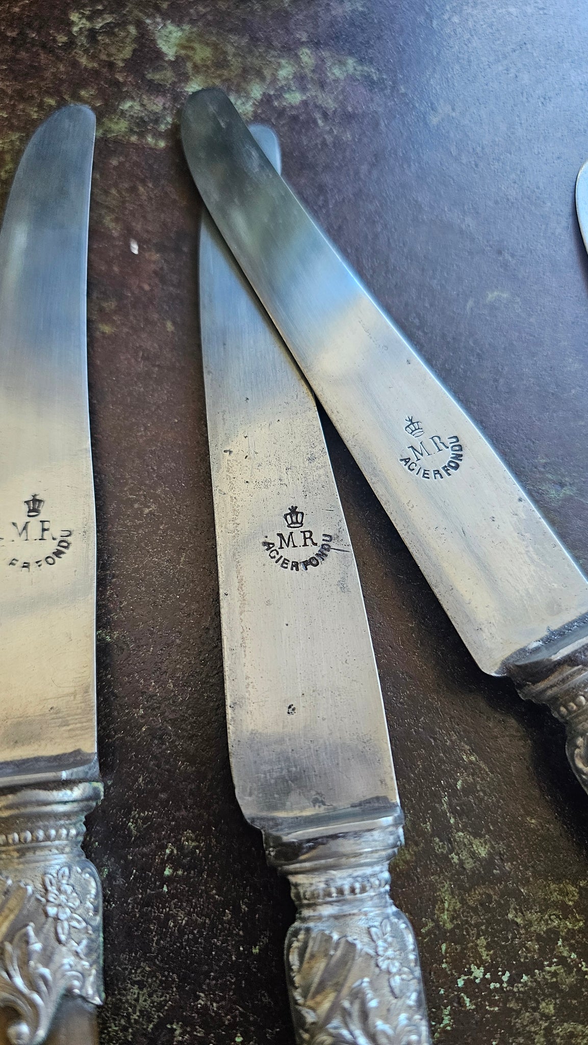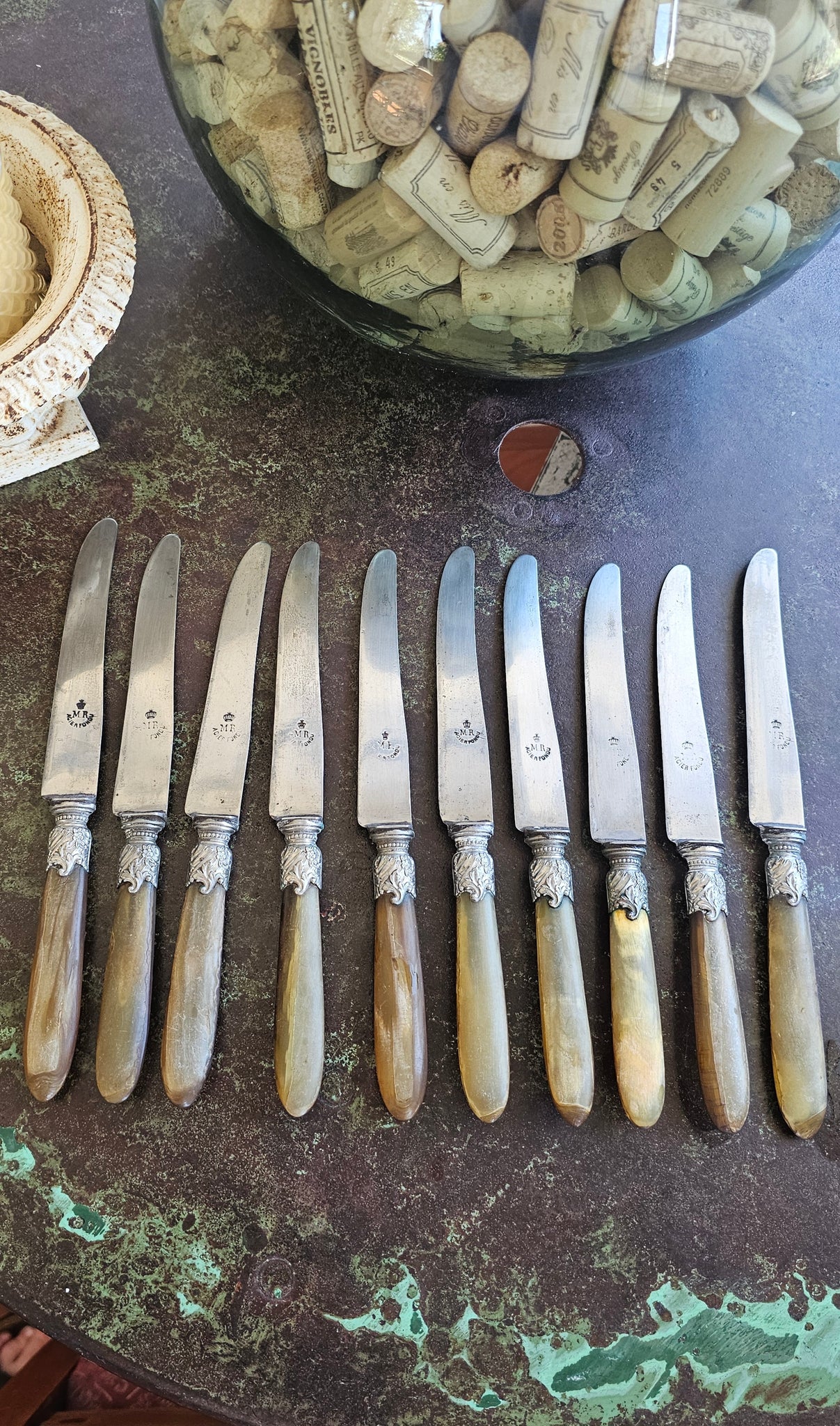 From Limoges, this beautiful set of TEN bone handled knives are marked ACIER FONDU which means the steel is superior. Silver plated clasps.