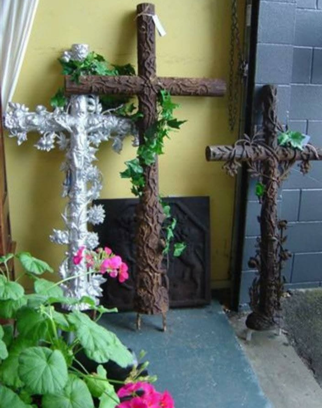 Gorgeous antique French iron cross decorated with vine leaves and grapes (middle cross in first pic) dating mid to late 1800s this was called a vineyard guardian cross