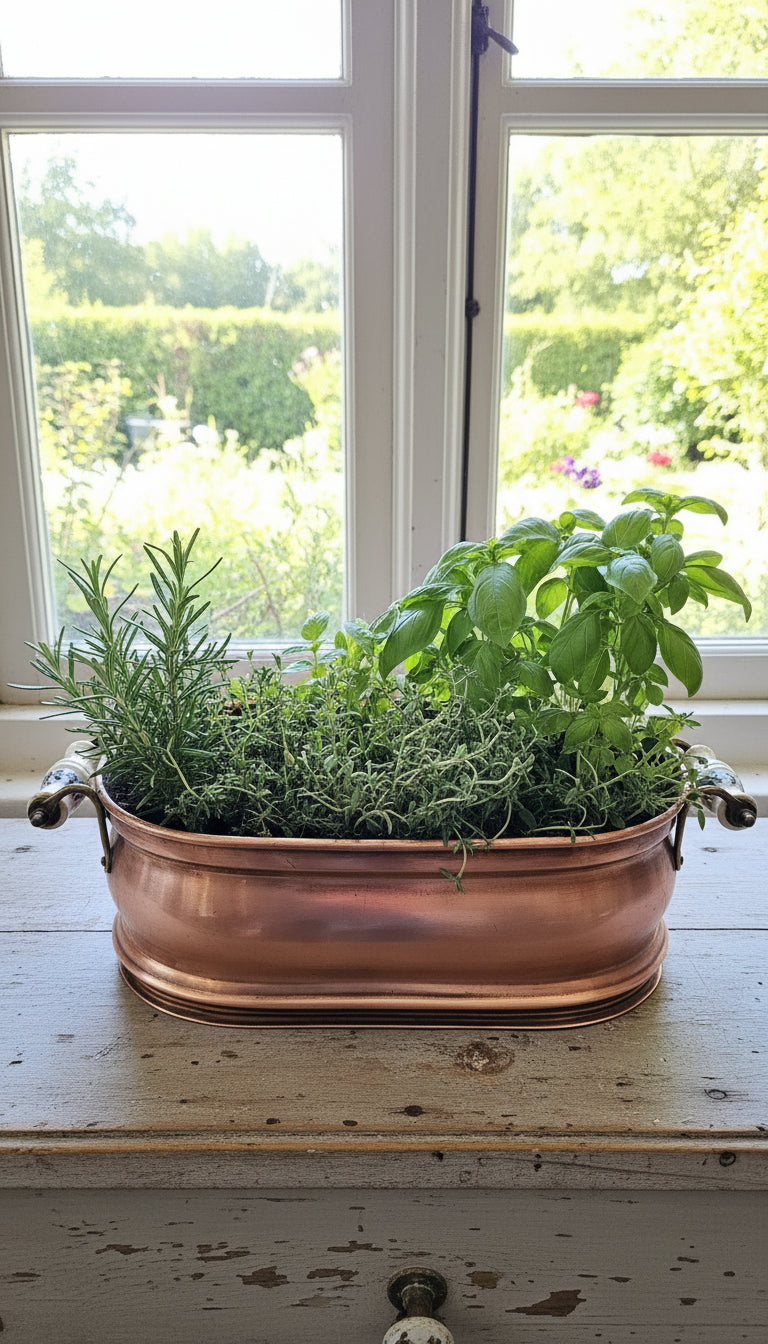 Perfect for herbs in the kitchen window, antique copper jardiniere with ceramic handles...41cm l, 17cm w, 13cm h