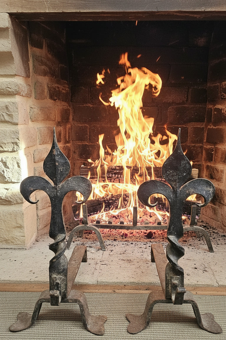 Incredible pair of antique French iron chenets (for in front of a fireplace to hold logs) from the 1800s they are very special having the fleur de lys