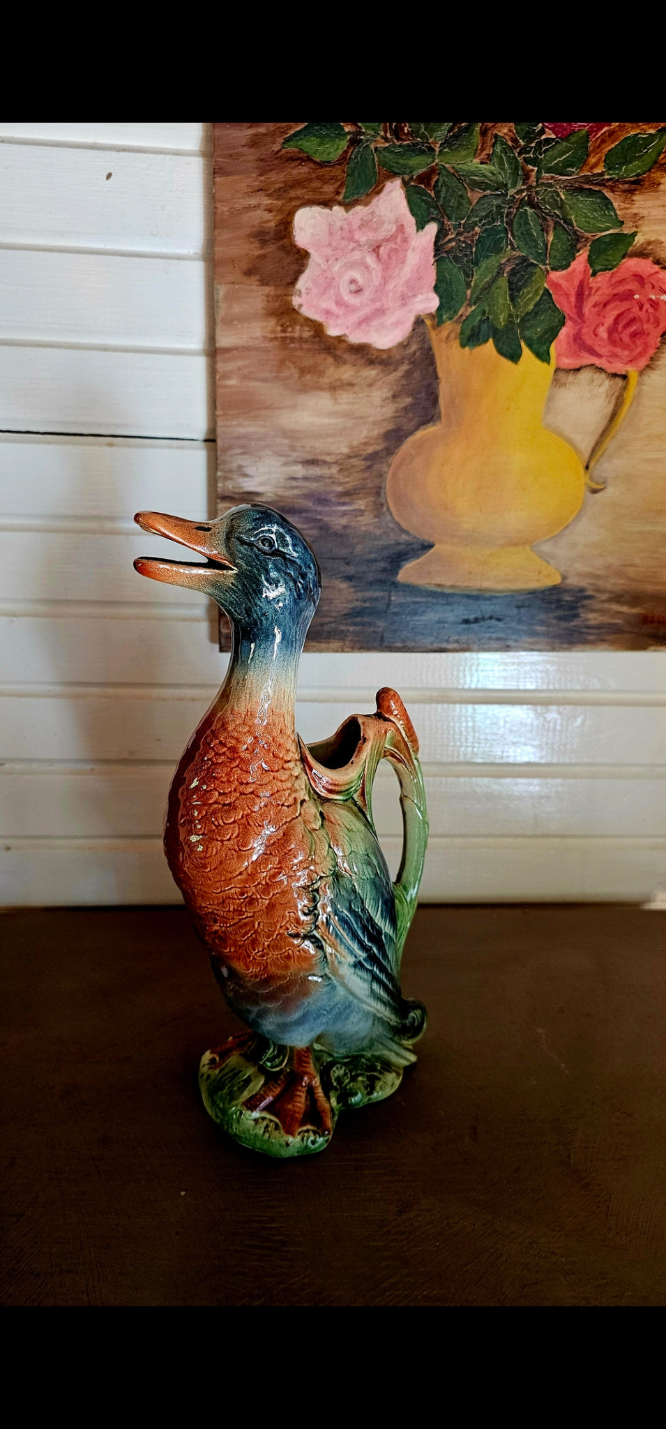 Majolica glazed barbotine duck decanter from the Art nouveau period, made by Saint-Clement, France
