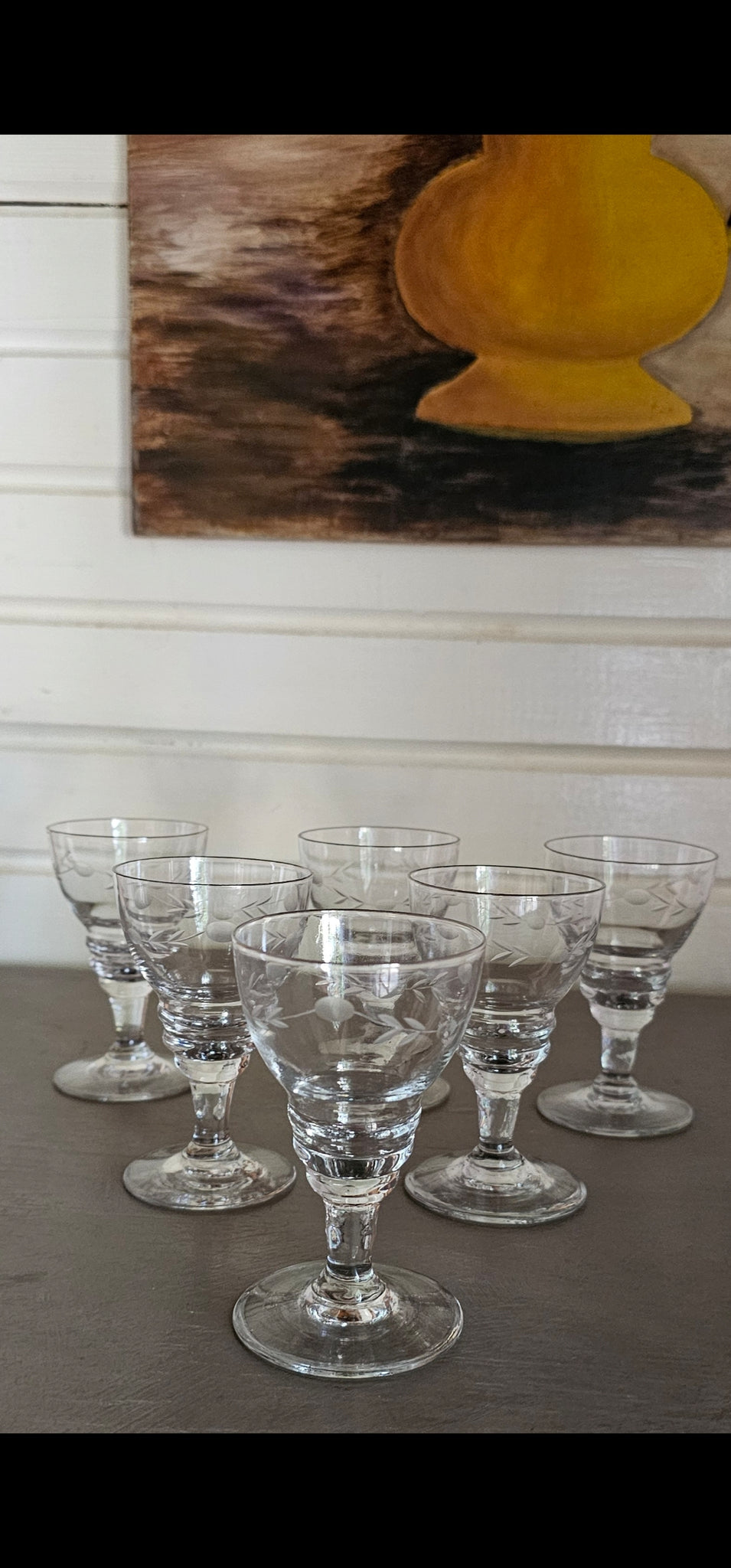 Lovely shaped small crystal etched wine glasses, set of 6. Dating 1940s, from central France