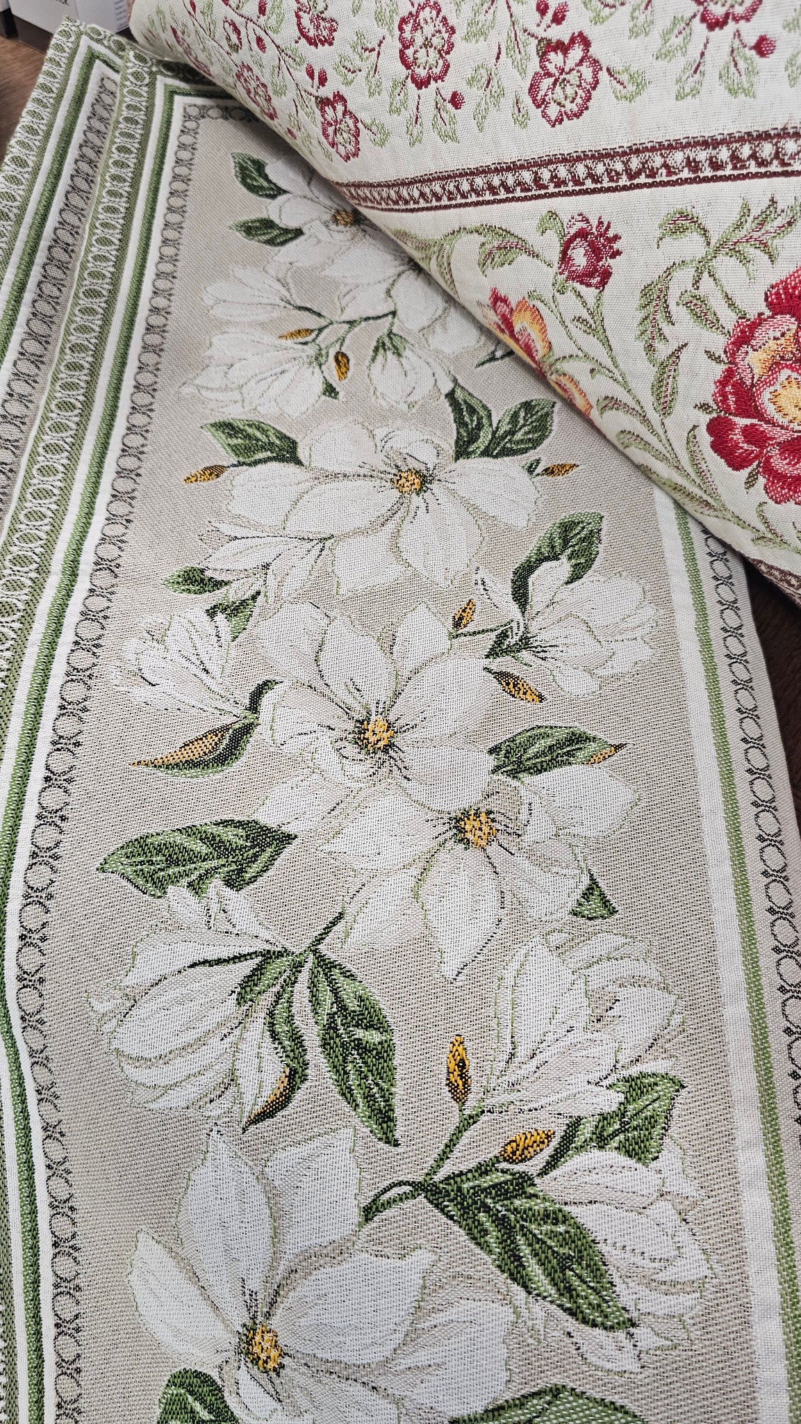 From France, these thick woven jacquard tablecloths make a great throw or to adorn the end of a plain bed cover. 2.5 m long, 1.40m wide.